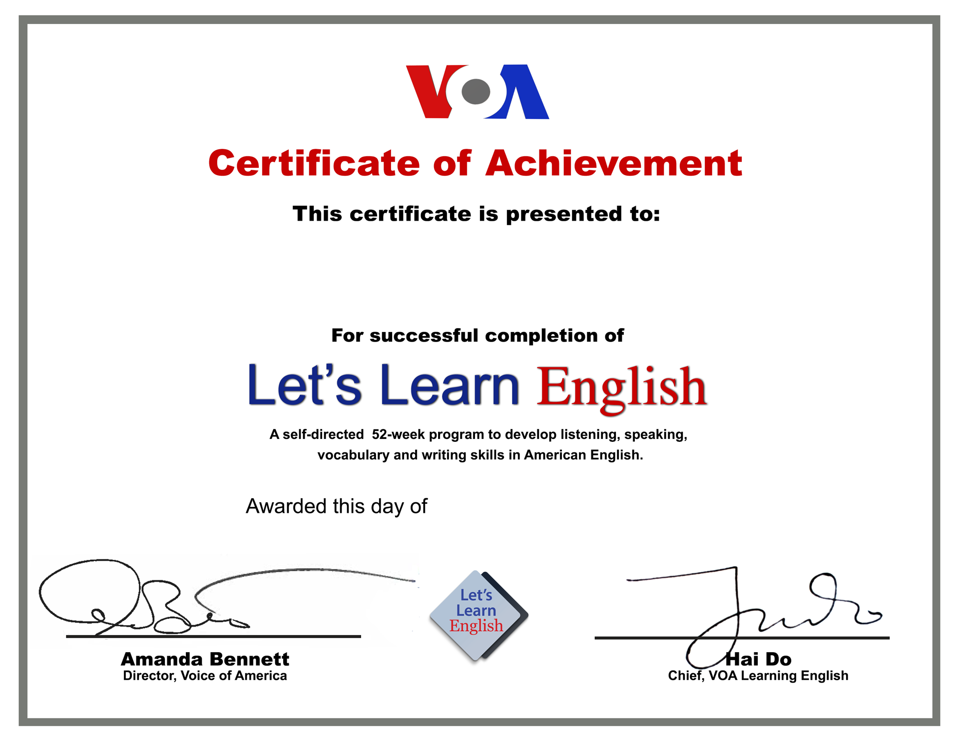 เพื่อเป็นการขอบคุณในการเข้ามาเรียนรู้ภาษาอังกฤษจากเรา เรามีใบประกาศนียบัตรจบการศึกษาหลักสูตร Let's Learn English เพื่อให้ดาวน์โหลดและกรอกชื่อของคุณลงไปได้ และอย่าลืมแชร์ความสำเร็จนี้ผ่านทางเพจเฟสบุ๊ก VOA Learning English