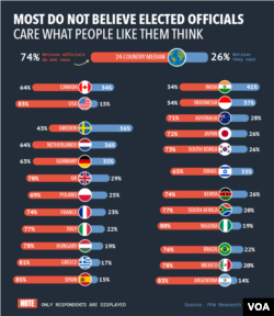 ในการตอบแบบสอบถามที่ว่า คนส่วนใหญ่ในเกือบทุกประเทศบอกว่า ผู้ที่ชนะการเลือกตั้งมาไม่ได้สนใจในสิ่งที่พวกตนคิดนักและ 42% รู้สึกว่า ไม่มีพรรคการเมืองใดที่เป็นตัวแทนมุมมองของตนเลย