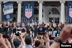 ประชาชนอเมริกันจำนวนมากเข้ารว่มในขบวนพาเหรดฉลองแชมป์ฟุตบอลโลกครั้งล่าสุดของทีมฟุตบอลหญิงสหรัฐฯ ซึ่งจัดขึ้นที่เกาะแมนฮัตตัน นครนิวยอร์ก ในวันพุธ